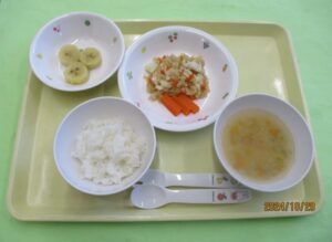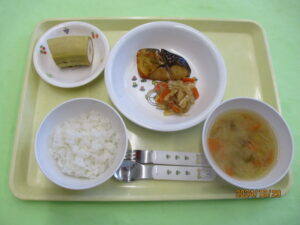 今日の給食は、ご飯・根菜汁・さばの照焼き・切干し大根煮・バナナです🍌。