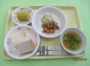 今日の給食は、食パン(いちご&マーガリン)・コンソメスープ・照焼きチキン・ポテトサラダ・バナナです🍌。