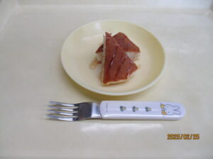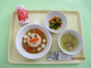 アンパンマンカレーを、2月のお誕生会のメニューにしました🎂。主役たちはもちろんのこと、小さい組の子たちもとても大喜びでしたよ🥰。アンパンマンのお顔は人参ご飯です🥕。何故かばなな組のみんなは、お顔の海苔や人参をはがしながら食べ始め、カレーの方はトッピングのチーズが真っ先になくなっていました🤣。それからしっかり完食してくれました🍛。
