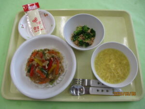 今日の給食は、チンジャオロース丼・中華風コーンスープ・ブロッコリーのツナ和え・チーズです🧀。
