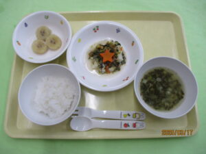 今日の給食は、ご飯・みそ汁・カレイのマヨみそ焼き・おかか和え・バナナです🍌。