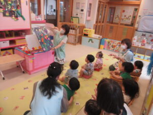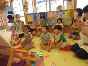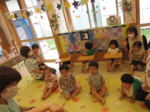 🎵たなばたさま🎵の曲に合わせて七夕さまのシアターをみました。体を前にしながら夢中になっていましたよ🙌