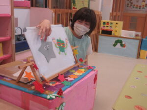 初めはみんなのお願い事を紹介しましたよ。織姫と彦星になったみんなの写真がでてくると、「~~ちゃん」「~~くん」と大きい声で呼んでくれました🌟