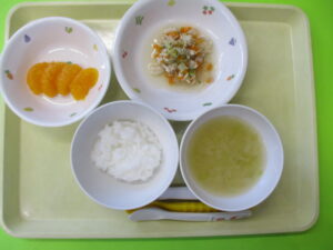 ごはん・みそ汁・鶏肉のケチャップ煮・オレンジ