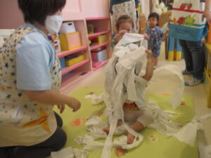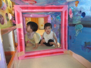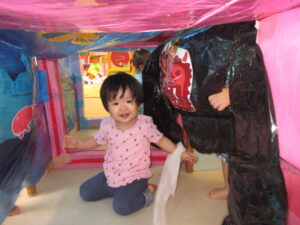 保育室で楽しいコーナーを準備して、体をいっぱい動かして遊びましたよ。