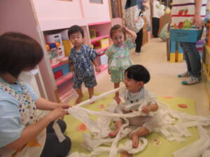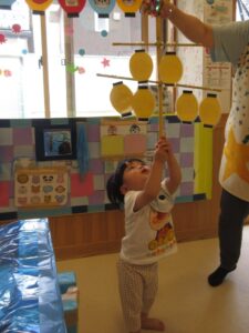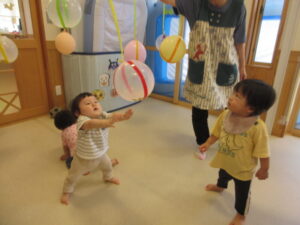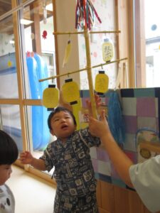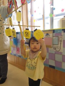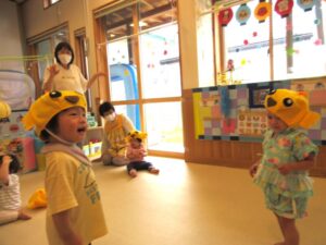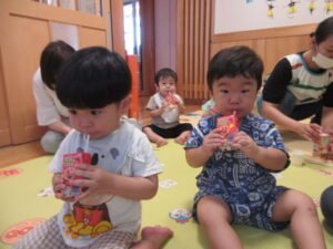 お外から、竿燈のお囃子の音が聞こえる中、ベビー園の夏祭りを楽しみました!!