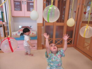 風船が揺れると鈴の音がして、みんな夢中です🎈