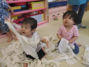 握ったり、ちぎったり、頭の上にのせたり降らせたりして
