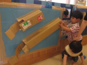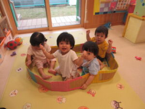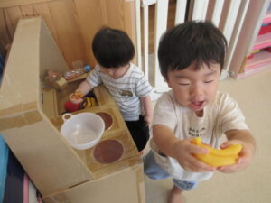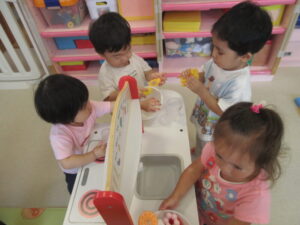 おままごとでは、好きな食べ物をモグモグしてみたり、「はい、どうぞ!」と先生にごちそうしてくれたり😊