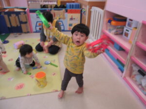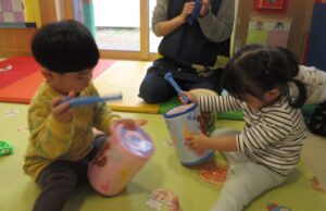 今日は曲に合わせて楽器を鳴らして遊びました♬