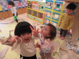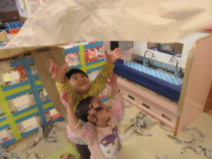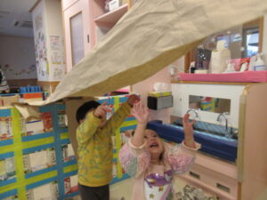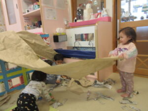 大きな紙を出すと、テントの様にしたり、風をふわっと送ったりして遊びました。