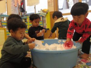 今日はお部屋の中でちょっぴり雪遊びをしました。