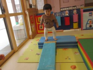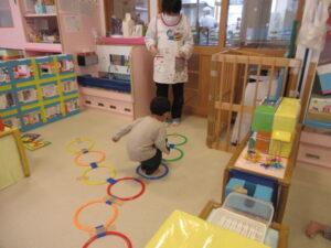 お外に行けない日にはマットを使ったり、ミニミニジャンプ台をしてみたり、〇の中をぴょんぴょんしたり、体をたくさん使っての遊びもしています。