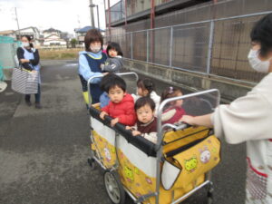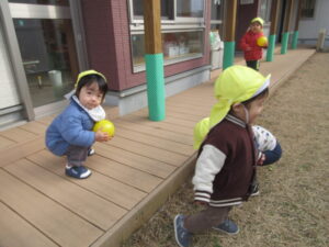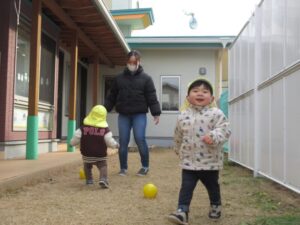 この日は晴れ間をみて、ちょっぴりお外でも遊びました。思い切り走れるのでとても嬉しそうなみんなでした。