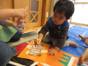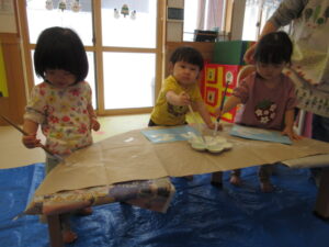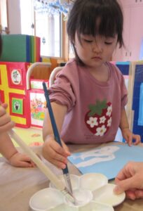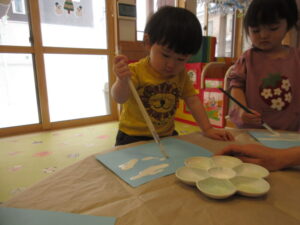たまごくみさんは絵の具でお絵描きをしました。筆の使い方がとても上手でビックリ!!何ができるかはお楽しみに😊