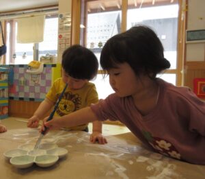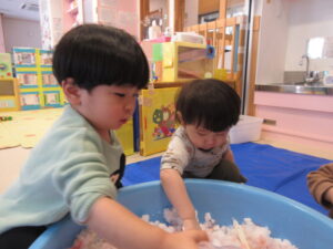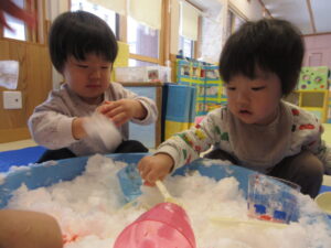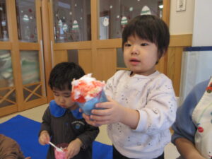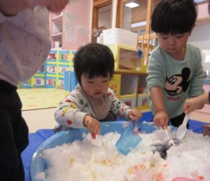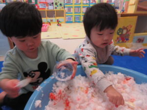 お外から雪を運んで、半分氷った色水を混ぜてみんなで遊びました!白い雪に色がついていくのを不思議そうにみたり、スプーンで混ぜ混ぜして上手に色を付けたりして遊んでいましたよ。