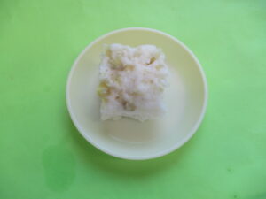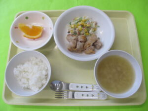 ごはん・みそ汁・鶏の唐揚げ・大根サラダ・オレンジ