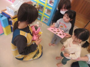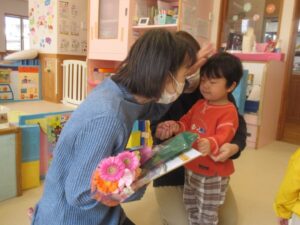 そして、4月からお別れする先生とのお別れ会をしました。全員でお花と色紙のプレゼントを送りました。さみしくなりますが、時々みんなの顔を見に来てくださいね💗