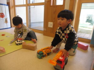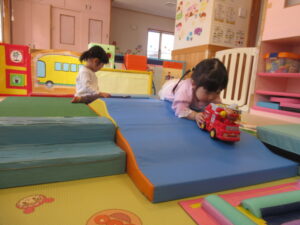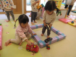 車がどうなっているのか構造をじっくり見ていたり、たくさんの車を駐車場に並べたり、枠を道路に見立てて走らせたり✨
