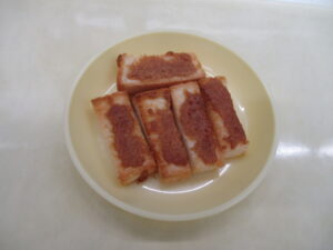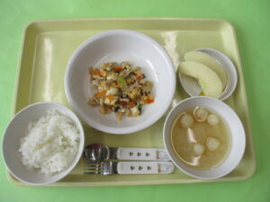 今日の給食は、ご飯 みそ汁 野菜チャンプルー りんごです。 野菜たっぷりのチャンプルーはみんなもりもり食べていました♪ 今日の15時おやつは、きな粉ラスクです。