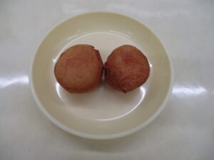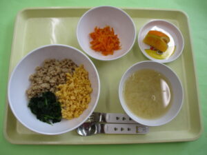 今日の給食は、三色丼 みそ汁 人参しりしり オレンジです。 今日の15時おやつは、ミニアメリカンドッグです。