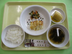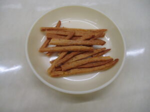 今日の給食は、ご飯 すまし汁 カレイのみそチーズ焼き のり和え バナナです。 すまし汁はすぐに飲み干す子が多かったです🎵 今日の15時おやつは、野菜ポッキーです。