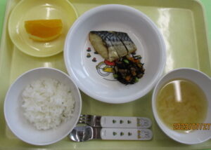 今日の給食は、ごはん・みそ汁・サバの塩焼き・ひじき煮・オレンジです🍊。