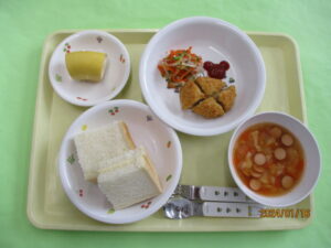 今日はパン食🍞。スープは具だくさんのミネストローネです🍅。色々なABCマカロニが面白いですね。きゃべつ入りのメンチカツとベーコンサラダをおかずに、どの子もきれいに食べてくれました🐷。