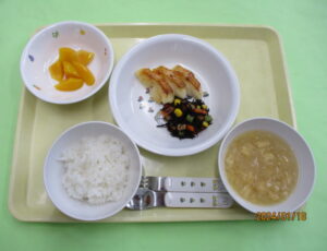 今日の給食は、ご飯・みそ汁・カレイのマヨみそ焼き・ひじき煮・黄桃缶です🍑。