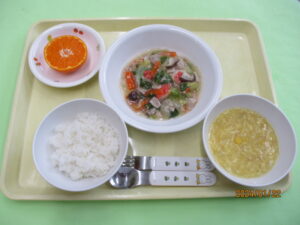 今日の給食は、ご飯・中華風コーンスープ・八宝菜・みかんです🍊。