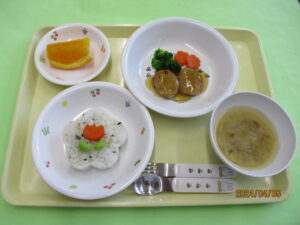 4月入園の子は今日が初めての給食でした🍴。おかずは残ってしまいましたが、かわいいお口でしらすわかめご飯を全部食べてくれましたよ🥰。ばなな組さんたちは、見事に全員完食❣ 進級のお祝い給食を喜んでくれました🌷🌸。