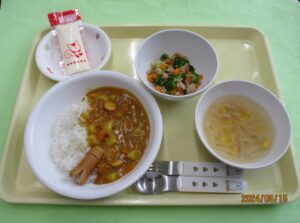 今日の給食は、ウィンナーカレー・ベーコンスープ・ブロッコリーのツナ和え・チーズです🧀。