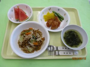 今日の給食は、焼きそば・わかめスープ・鶏の唐揚げ・添野菜(枝豆、とうもろこし)・スイカです🍉。